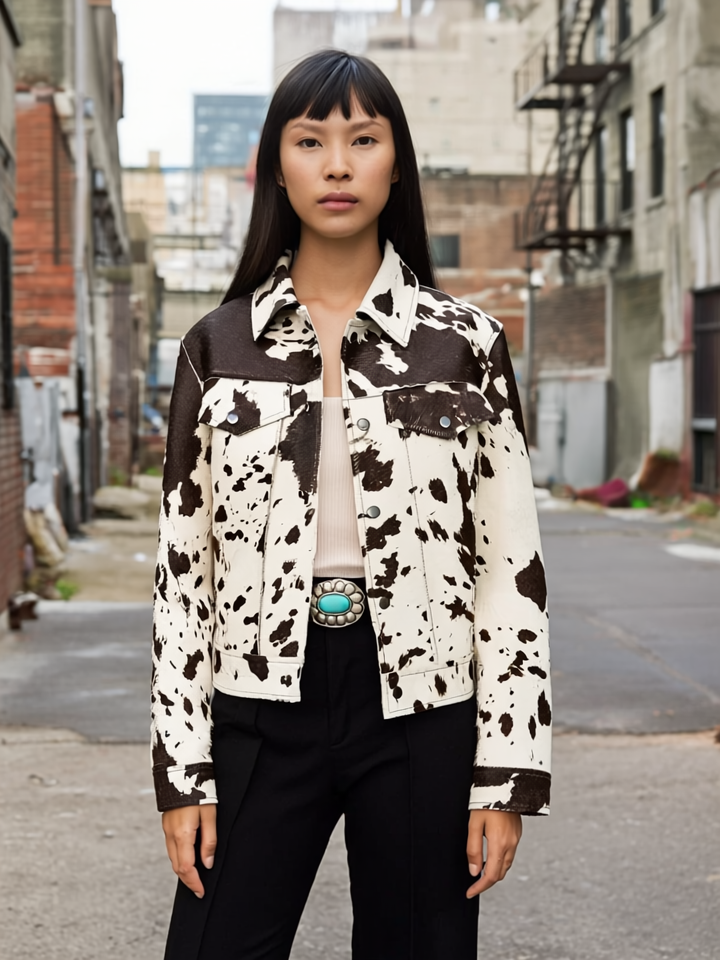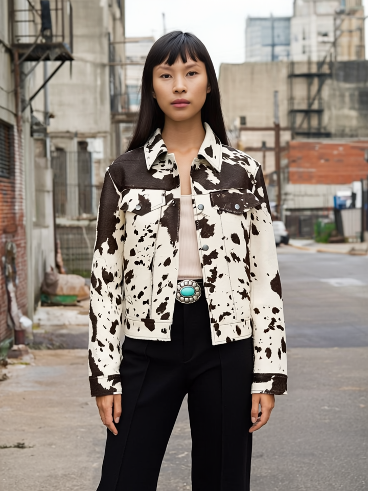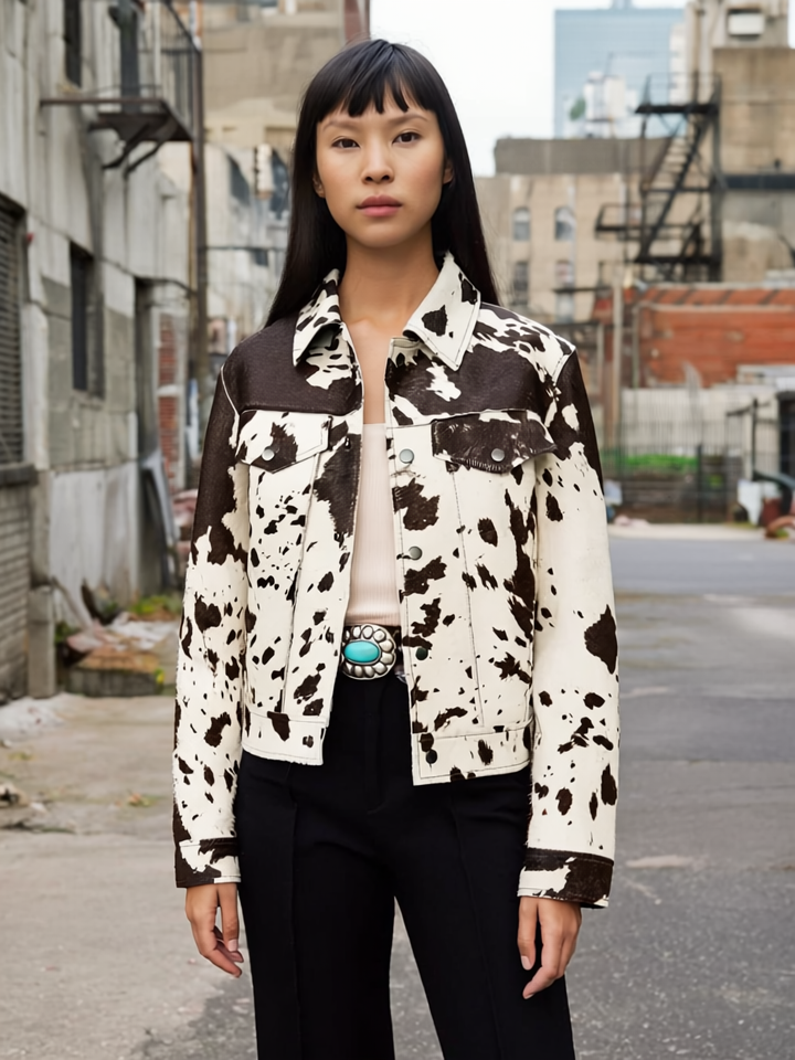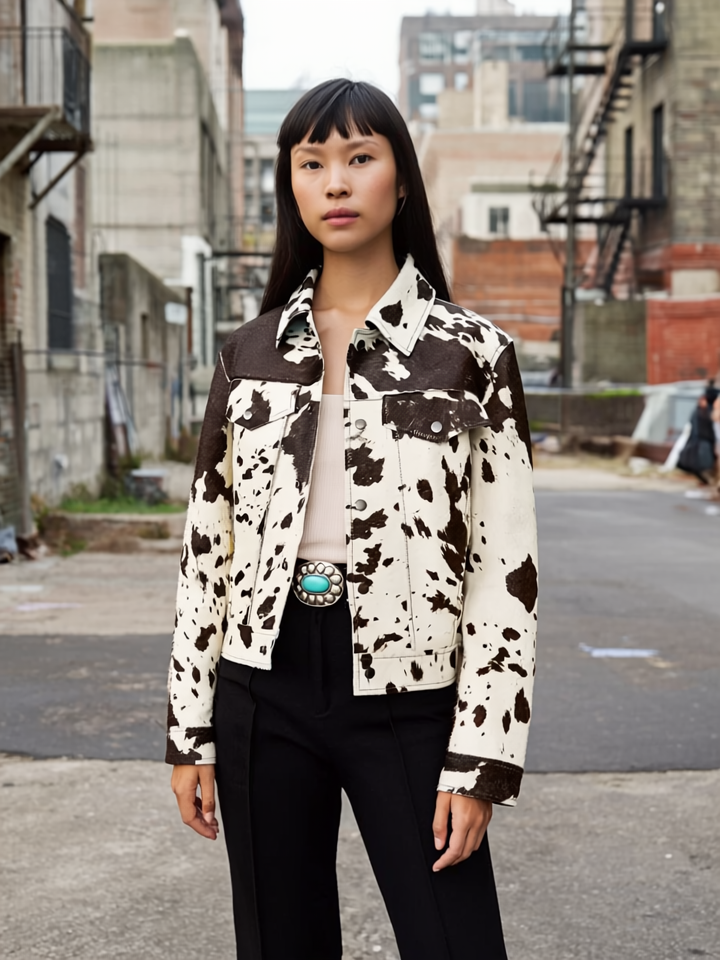 - Design: Charakterystyczny wzór krowy nadający kurtce nowoczesny charakter.