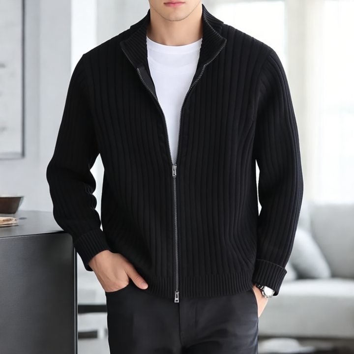 - Design: Kardigan zapinany na zamek z prążkowanymi mankietami i dołem