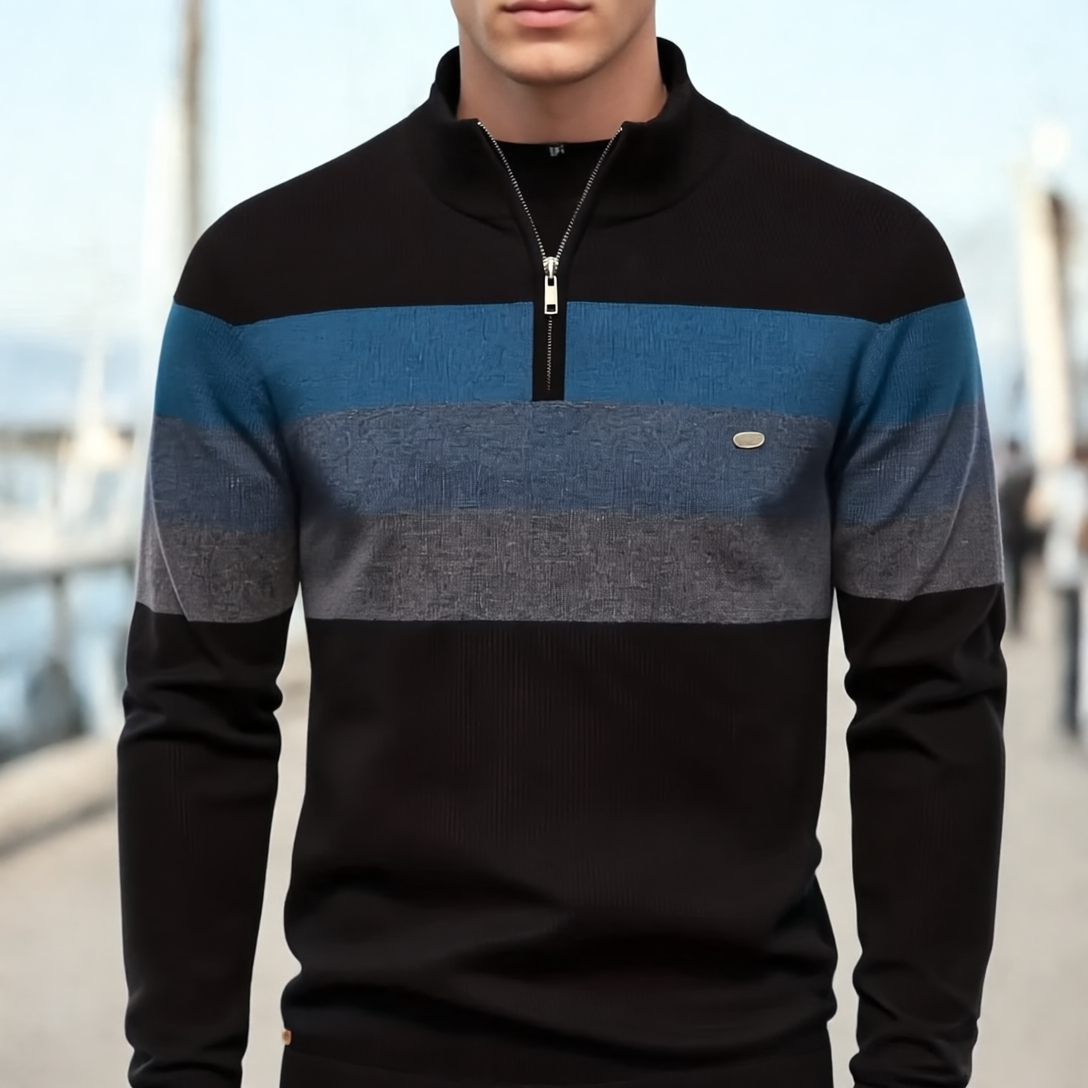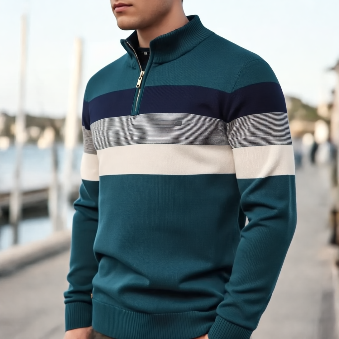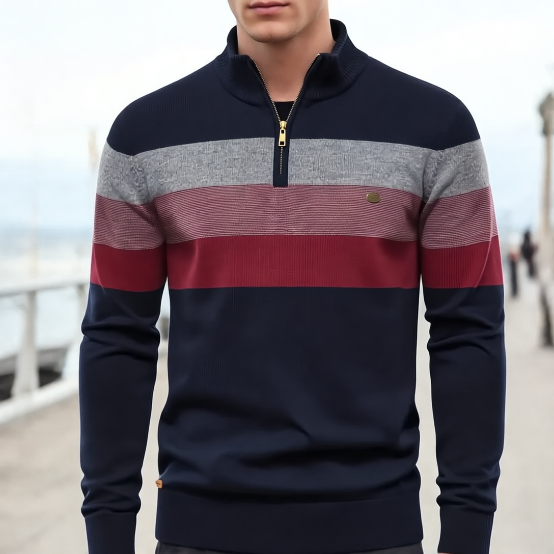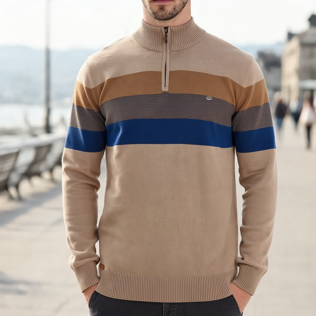Sweter w paski Liam łączy nowoczesną elegancję z komfortem termicznym. Wykonany z mieszanki wełny i poliestru zapewnia ciepło i trwałość, jednocześnie pozostając przewiewny. Starannie dopasowany krój oraz miękka podszewka gwarantują przyjemne uczucie podczas noszenia, a wysoki kołnierz zapinany na zamek dodaje praktyczności i stylu.