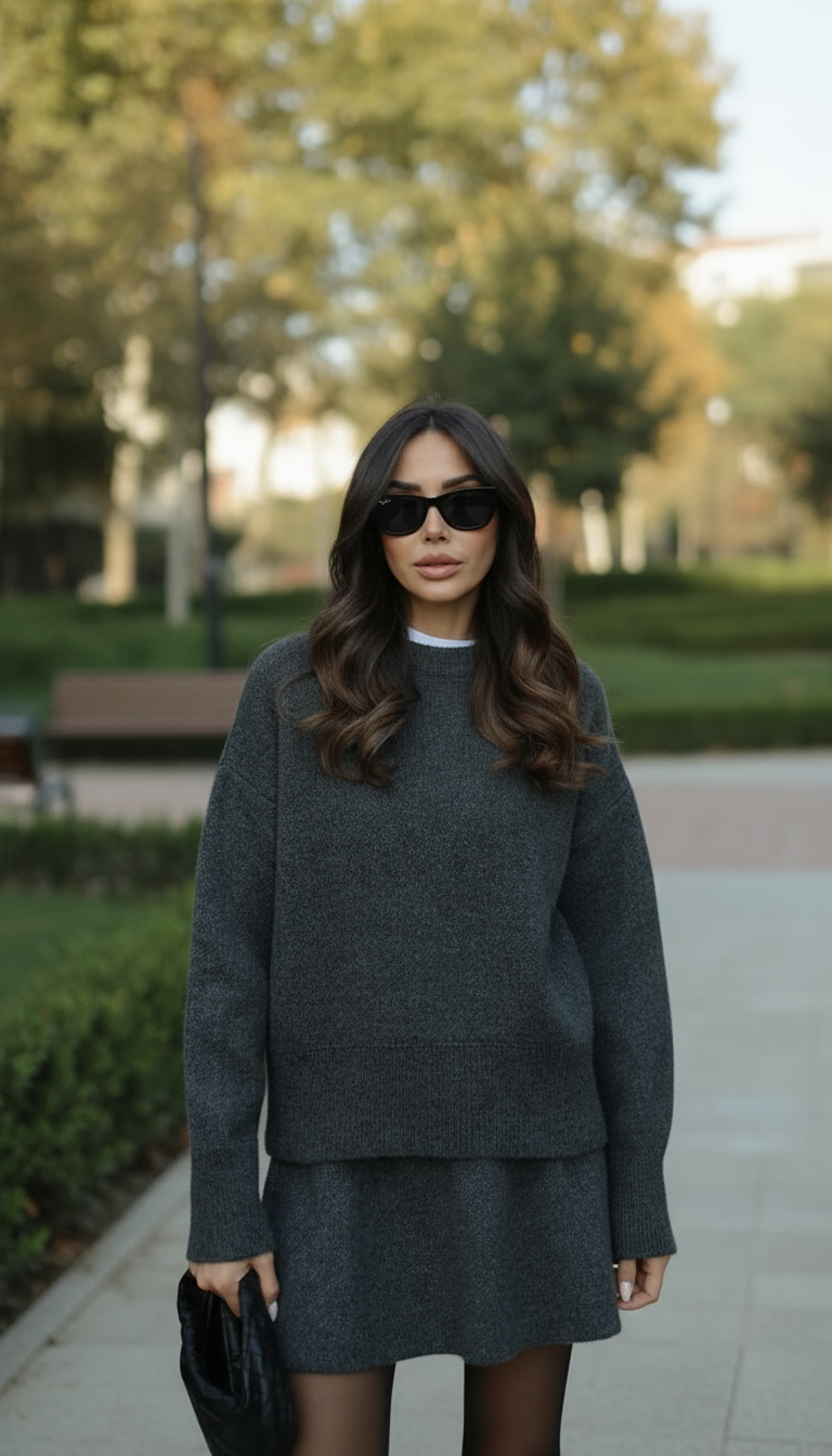 Zestaw Lucie z miękkiej wełny został zaprojektowany, aby zapewnić ciepło, komfort i elegancję w sezonie jesiennym. Jego nowoczesny i dopracowany krój sprawia, że to idealny wybór dla kobiet, które chcą połączyć styl z wygodą na co dzień.