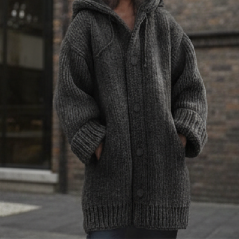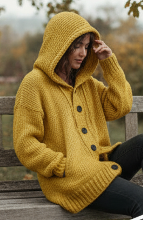 - Styl: Kardigan z dzianiny z wbudowanym kapturem