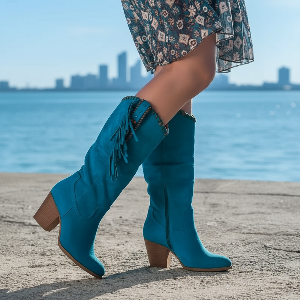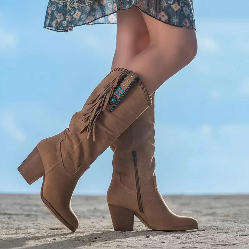 - Design: Wysokie botki kowbojskie z frędzlami i dopracowanymi detalami