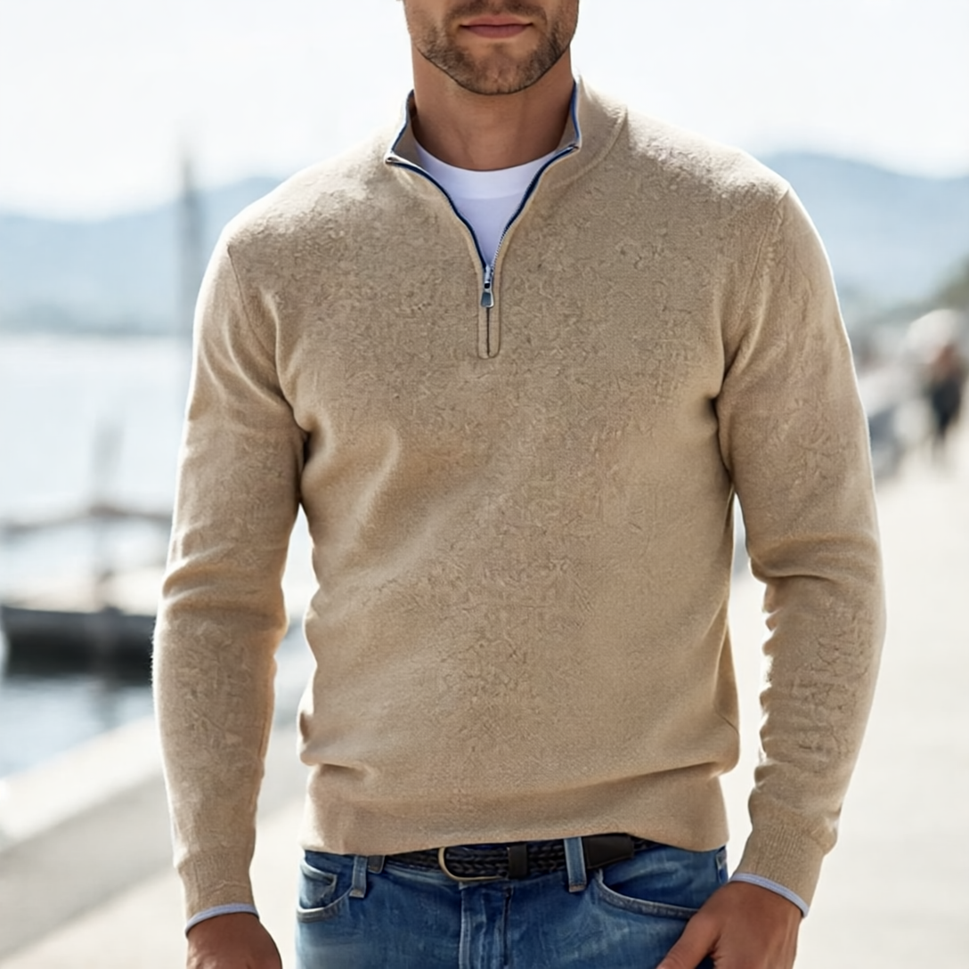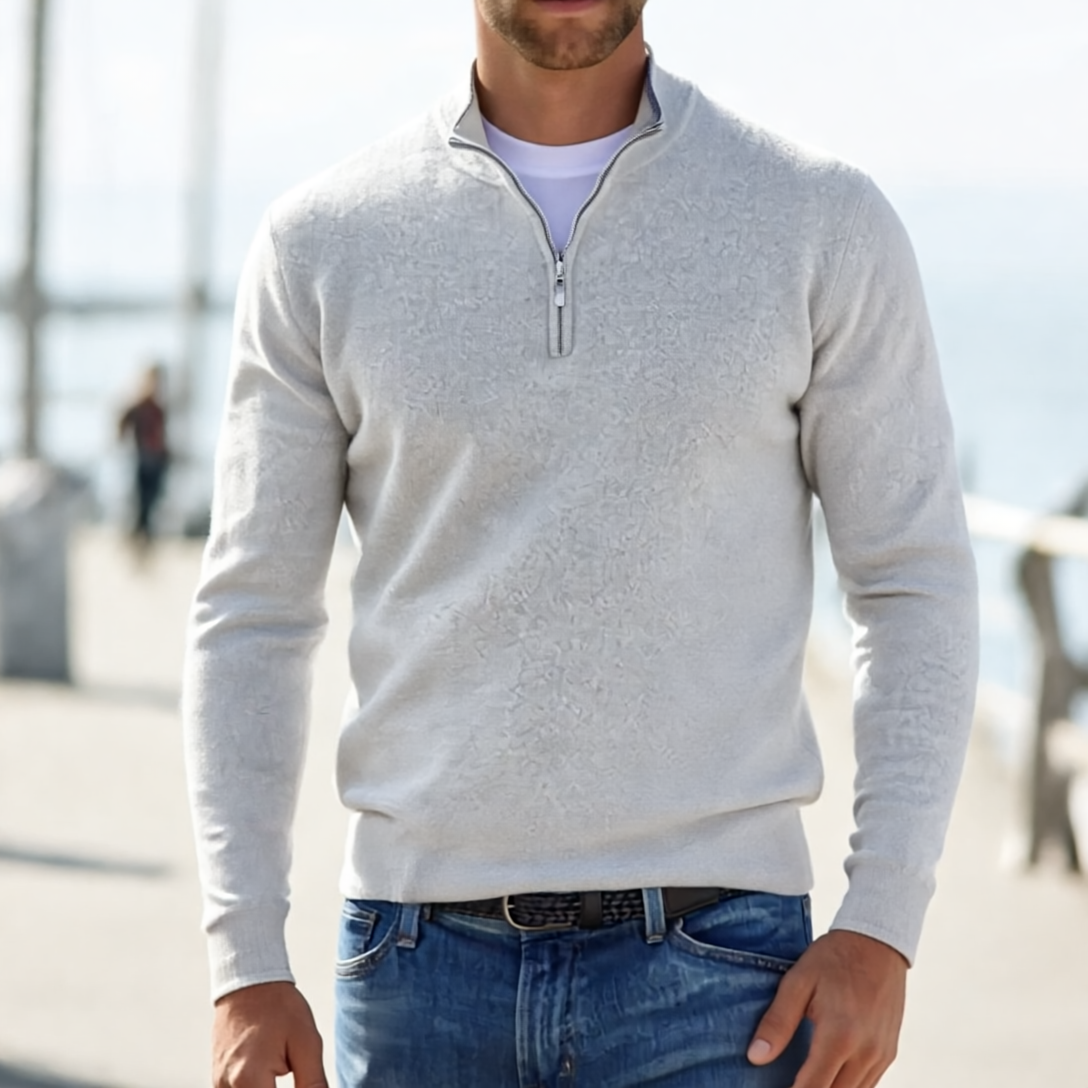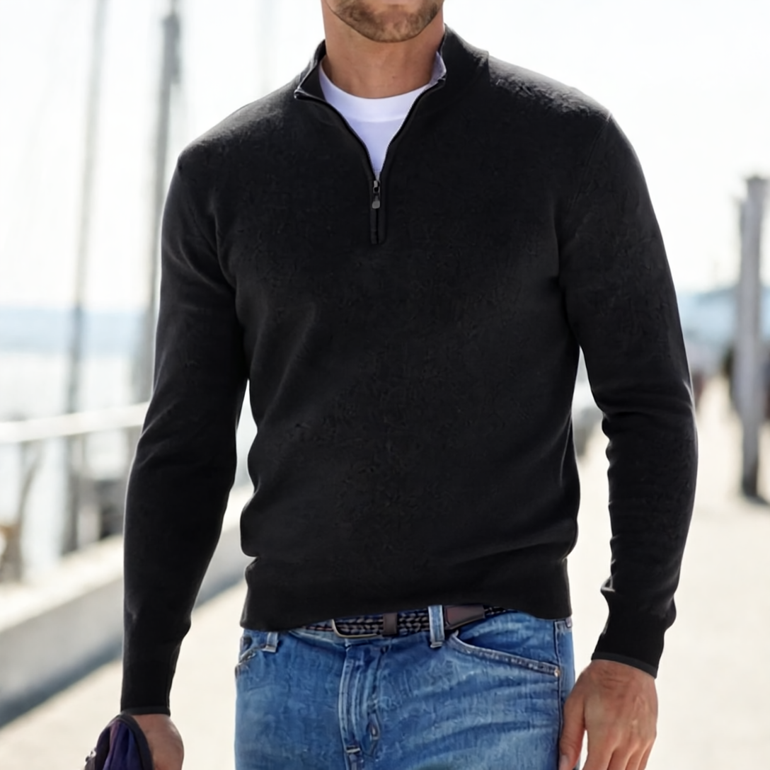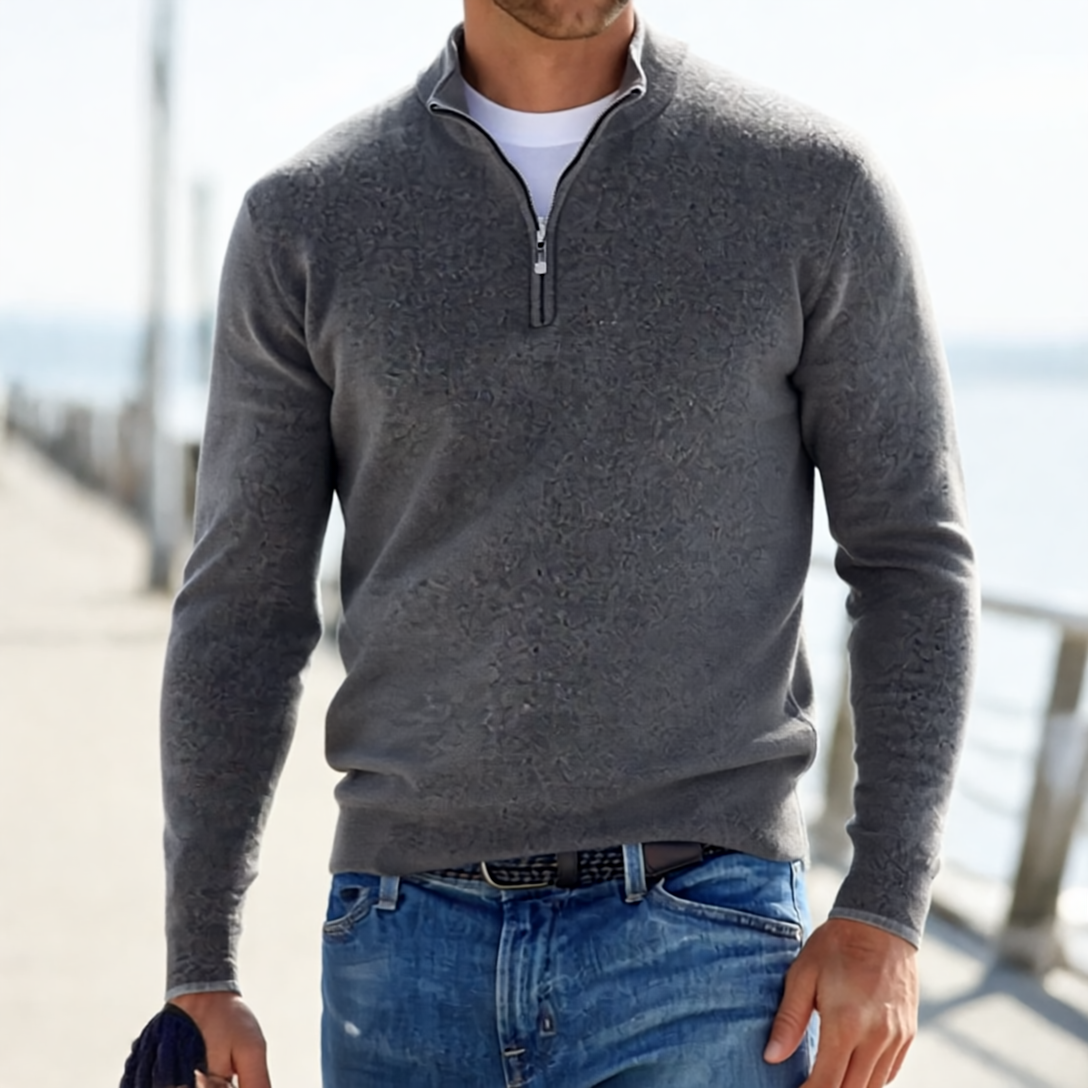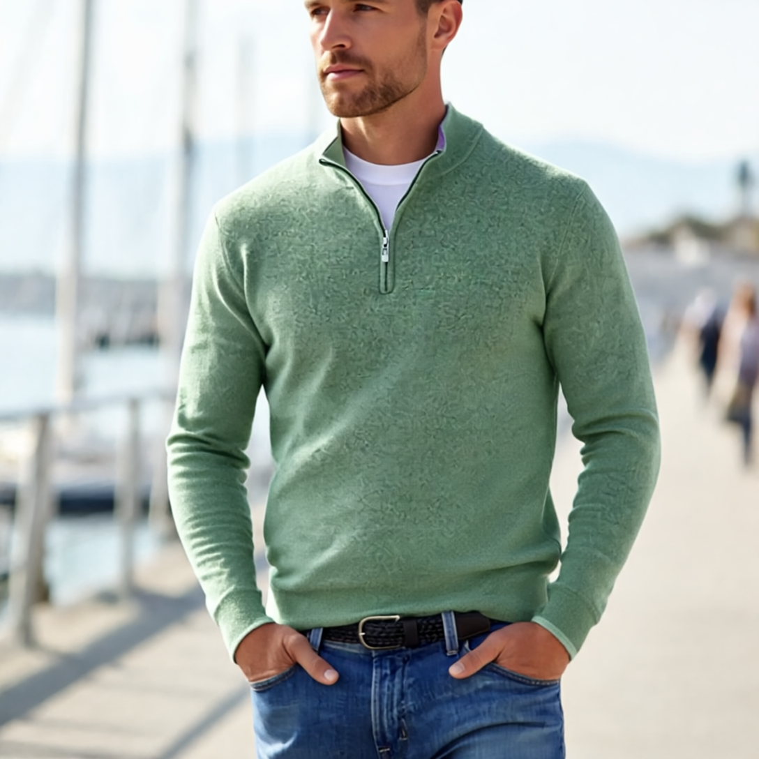 Sweter Noah z kołnierzem zapinanym na zamek łączy elegancję z praktycznością, czyniąc go niezbędnym elementem męskiej garderoby. Wykonany z mieszanki bawełny i poliestru zapewnia komfort, oddychalność oraz trwałość. Jego nowoczesny design i ponadczasowy krój sprawiają, że łatwo dopasować go do stylizacji zarówno casualowych, jak i półformalnych, tworząc uniwersalny look na każdą porę roku.