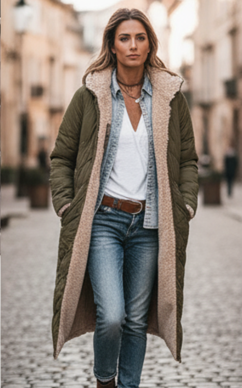 - Podwójny styl: Odwracalny krój — dwa różne looki w jednym płaszczu.