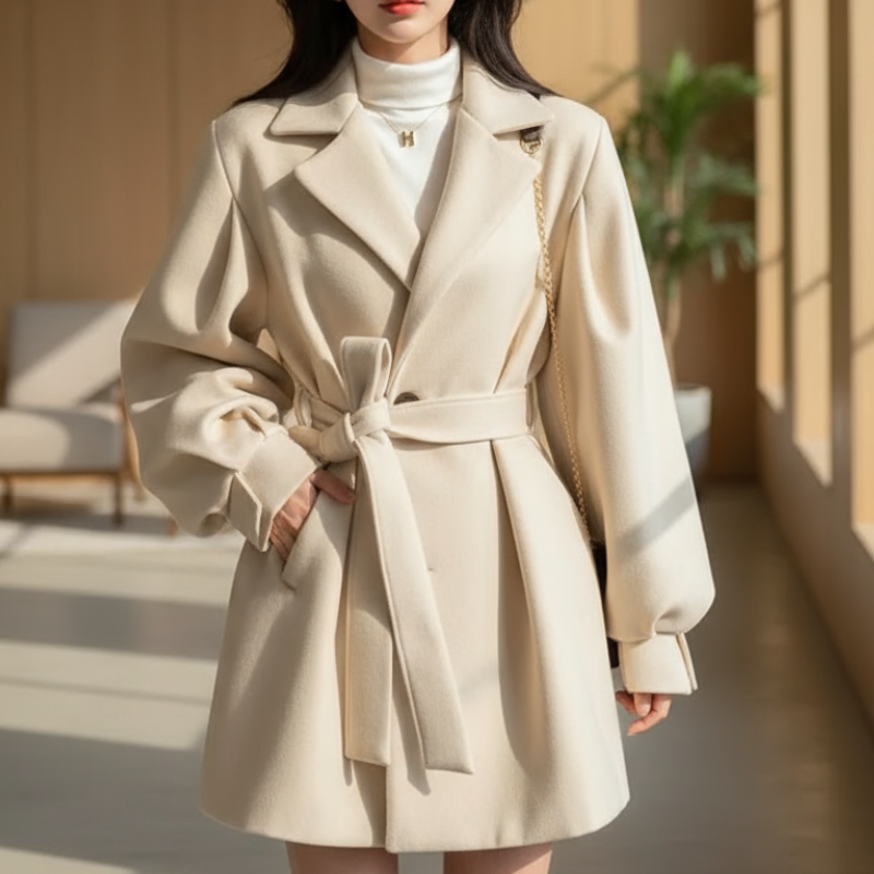 - Design: Damski trencz z paskiem w talii i dopracowanymi detalami.